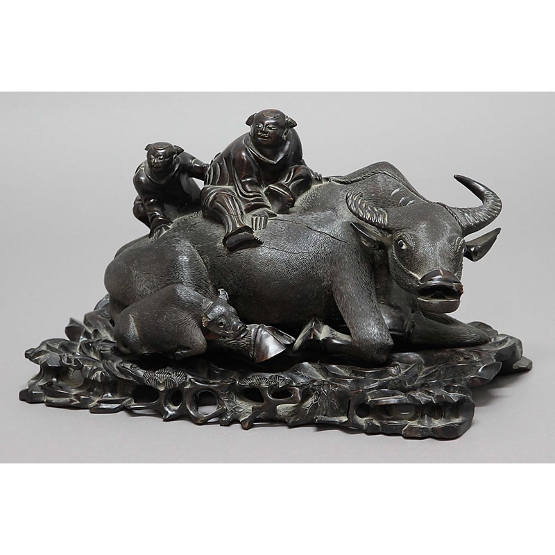 CHINESE HARDWOOD BUFFALO, CALF AND TWO CONFUCIAN BOYS,