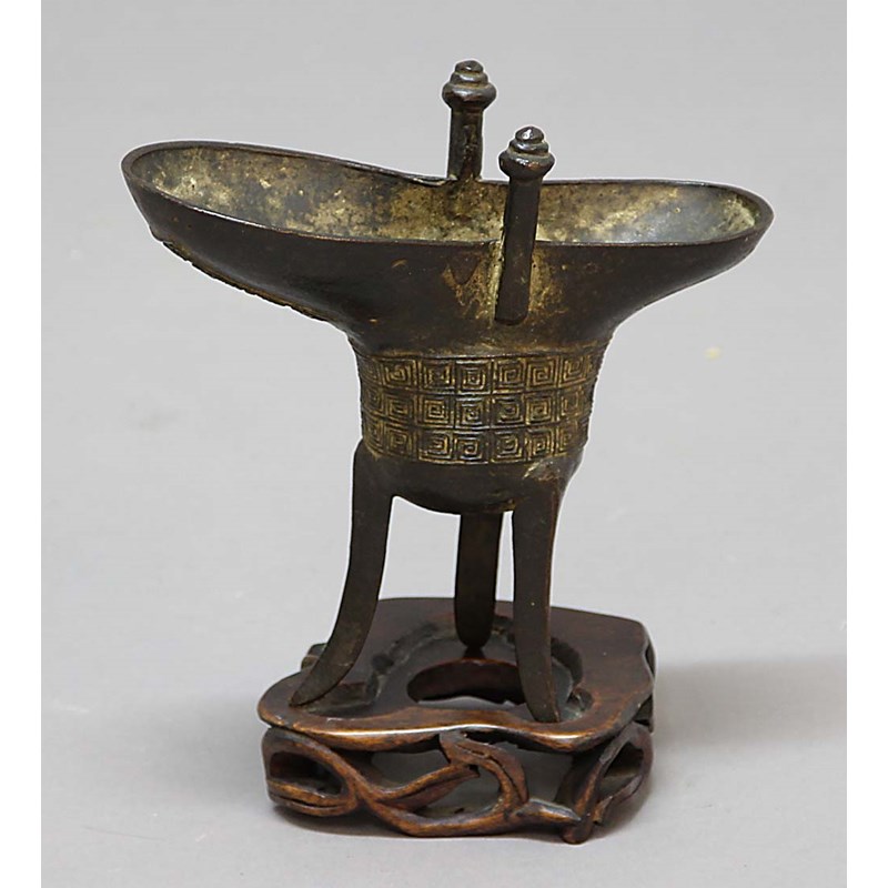 CHINESE ARCHAISTIC BRONZE JUE VESSEL, the underside of the larger lip with a nine character inscription, with hardwood stand, height 15.5cm