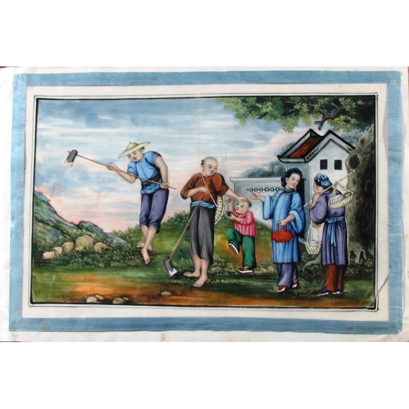 circa 1900, painted in watercolours with various scenes from the growth, picking, drying and tasting of tea, each picture 19cm x 30cm