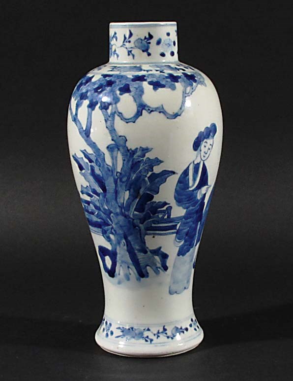 CHINESE BLUE AND WHITE BALUSTER VASE, painted with figures in a garden, blue Kangxi four character mark but 19th century, height 23.5cm