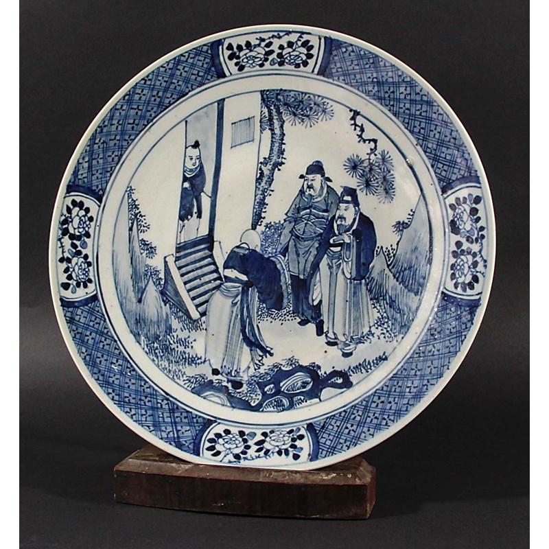 painted with three figures outside a house, inside a trellis and cartouche border, Kangxi style but 19th century, diameter 35cm
