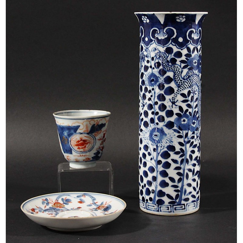 CHINESE BLUE AND WHITE SLEEVE VASE, painted with a pair of scrolling dragons, Kangxi four character mark but later, height 26cm; together with an imari cup and trembleuse saucer, diameter of saucer 13cm (3)
