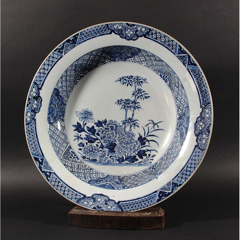 CHINESE BLUE AND WHITE BOWL, painted with peonies and rocks inside diaper and panel borders, Qianlong, diameter 39.5cm