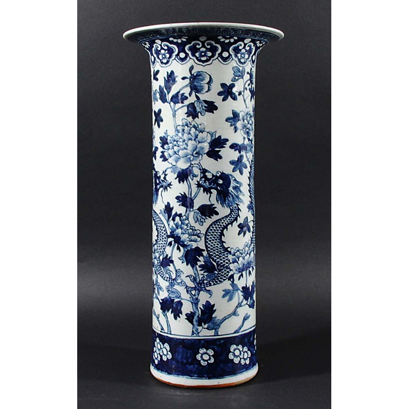 CHINESE BLUE AND WHITE SLEEVE VASE, painted with opposing dragons scrolling amongst flowering foliage, beneath a rui painted rim, height 44cm