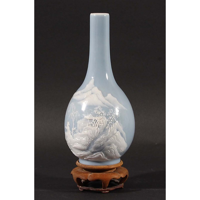 CHINESE BOTTLE VASE, with pate sur pate style decoration of a fisherman before steps up a mountain topped by a shelter on a pale blue grey ground, mid 20th century, blue painted four character seal mark, height 21cm