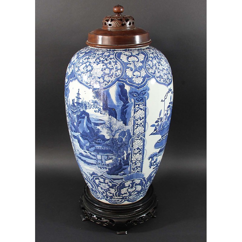 of slender ovoid form, blue painted with alternating panels of mountainous landscapes and baskets of flowers divided by foliage and dragon masks, above foliate lappets and beneath shoulders decorated with deer amongst scrolling foliage, with replacement hardwood and metal inlaid cover and ebonised stand, two blue concentric circles to the base, probably Kangxi, remains of dealer/collection paper label, height excluding cover and stand, 49cm (3)
