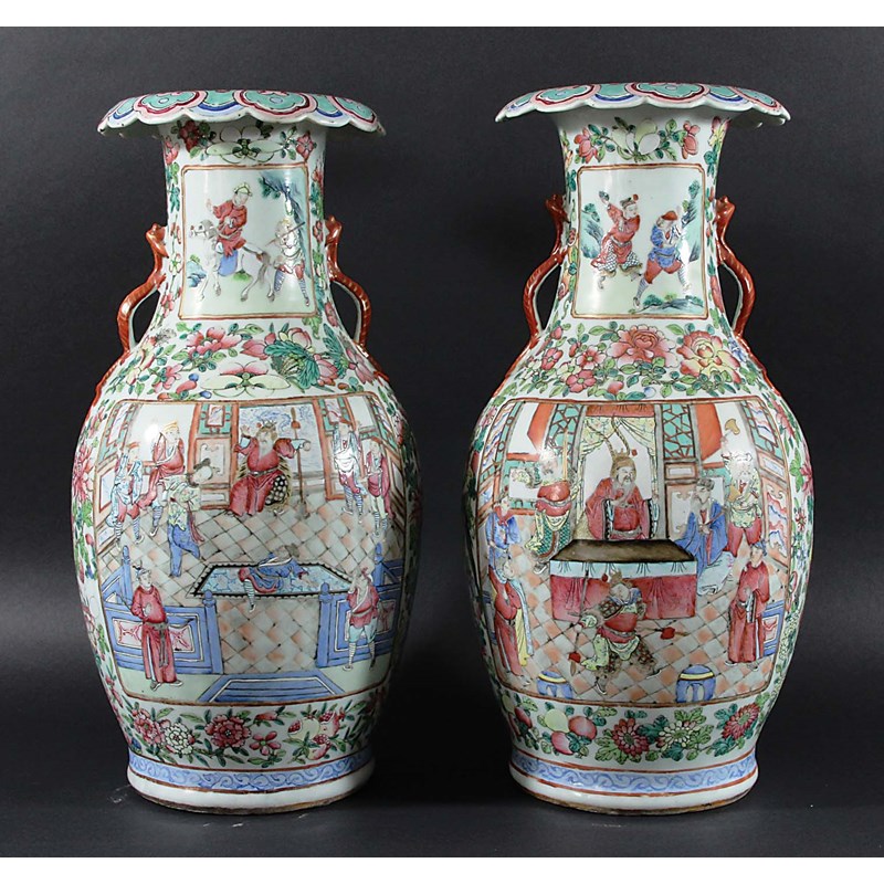 PAIR OF CHINESE CANTON VASES, late 19th century, of two handled baluster form, painted with scenes of a dignitary holding court on a famille rose floral ground, late 19th century, height 45cm (2)
