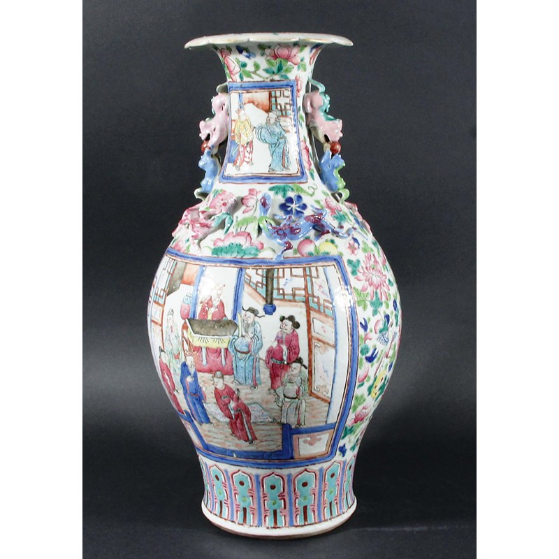 of baluster form, enamelled with courtiers in interior scenes beneath scrolling chilong and kylin handles, probably 19th century, height 43cm