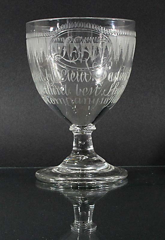 dated 10th July 1807, inscribed 'Presented by Lieut Darling to Mr W. hort being the third best shot, the first company', beneath the initals LSV in an oval cartouche, on a knopped stem and spreading foot, height 15.5cm