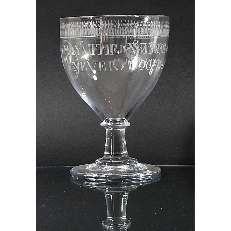 circa 1800, the bowl engraved with the inscription 'May the Wings of Friendship Never Loose a Fether', initialled JJ to the reverse, beneath a stylised foliate border, on a knopped stem and spreading foot, height 17cm