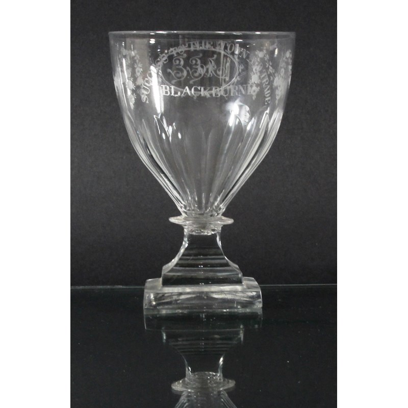 circa 1800, the faceted bowl with engraved inscription 'Success to the Town and Trade of Blackburne', the reverse with the initials JEE in an oval cartouche, with knopped, square section stem and stepped foot, height 13.5cm
