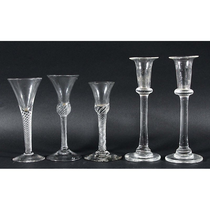 the bell shaped bowl on a multi-strand air twist stem and spreading foot, height 16.5cm; together with another, similar, with an air twist stem, pair of glass candlesticks and a collection of other drinking glasses (13)