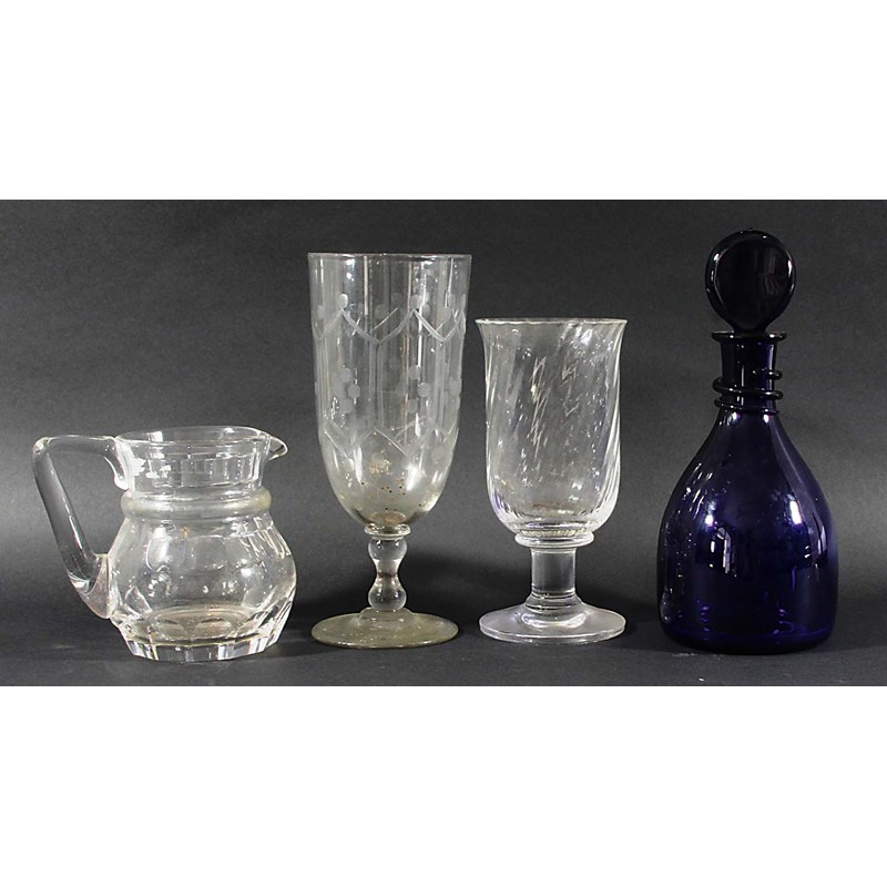 BRISTOL BLUE DECANTER AND STOPPER, circa 1800, of mallet form with spiral string neck, height 27cm; together with a cut glass water jug and two celery vases (4)
