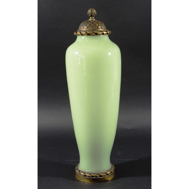 CELADON JADE GREEN GLASS AND ORMOLU VASE AND COVER, of slender shouldered form, the cover moulded with a basket weave design and flower bud finial, height 41cm