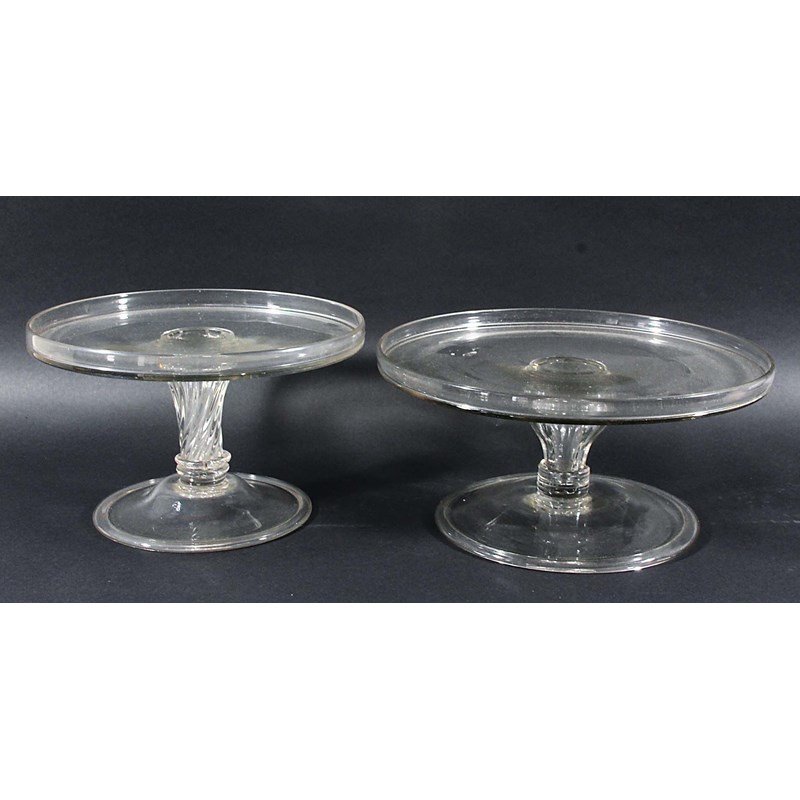 with swollen, inverted baluster stem, spreading foot and folded over rim, diameter 31.5cm; together with another similar with a wrythen moulded inverted baluster stem, domed foot with folded over rim, diameter 27cm (2)