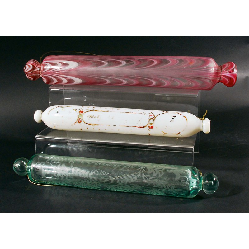 COLLECTION OF NINE GLASS ROLLING PINS, 19th century and later, including one Nailsea type, some with inscriptions and mottos, lengths 43cm and smaller (9)