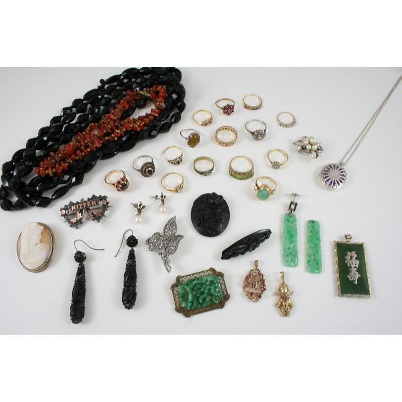 including a pair of Art Deco pierced and carved jade drop earrings, top missing on one, a jade and gold ring, a peridot five stone ring, set in gold, a diamond solitaire ring, set in 18ct. gold, a ruby and obsidian cluster ring, set in 18ct. gold, a diamond cluster ring, set in 18ct. white gold, assorted gold and gem set rings, and various other items of jewellery and costume jewellery.
