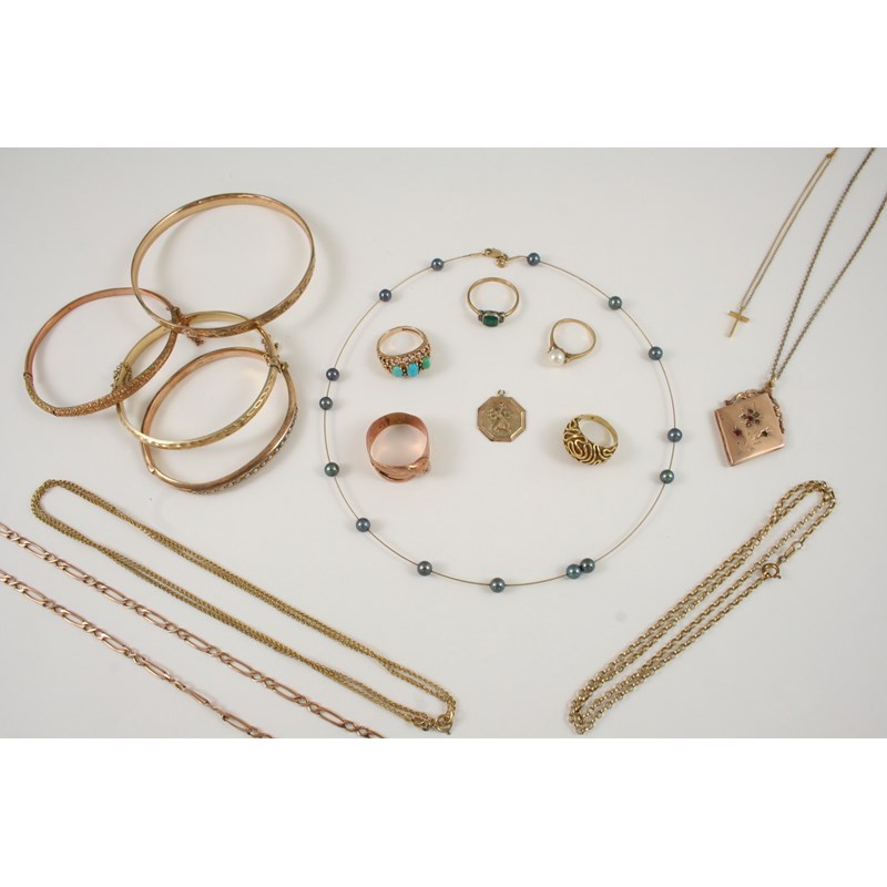including a 9ct. gold and cultured pearl necklace, a 9ct. gold and half pearl set half hinged bangle, a 9ct. gold and gem set pendant, a 9ct. gold chain necklace, 5.2 grams, a 9ct. gold fancy link necklace, 7.2 grams, a 9ct. gold chain, 3.5 grams, a 9ct. gold half hinged bangle, 6.1 grams, a 9ct. gold snake ring, 5.4 grams, and various other items.