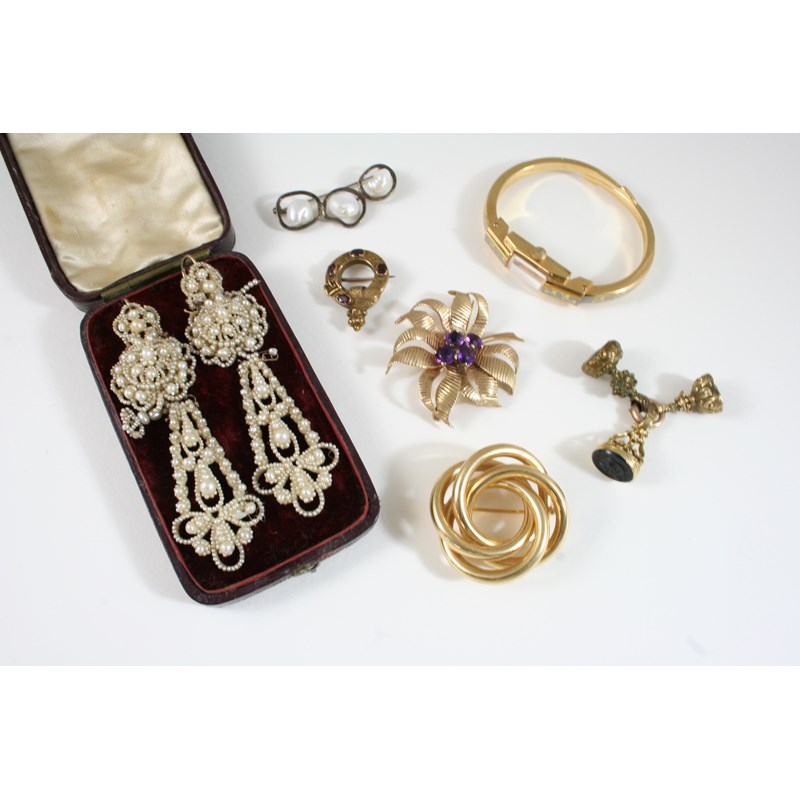 A QUANTITY OF JEWELLERY including a gold and amethyst flowerhead brooch, a gold swirl brooch, a pair of Victorian seed pearl drop earrings, and various other items.