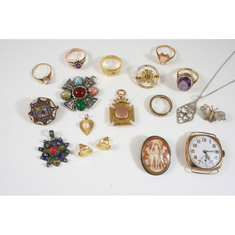 A QUANTITY OF JEWELLERY including a gold and amethyst ring, a shell cameo brooch depicting The Three Graces, and various other items.