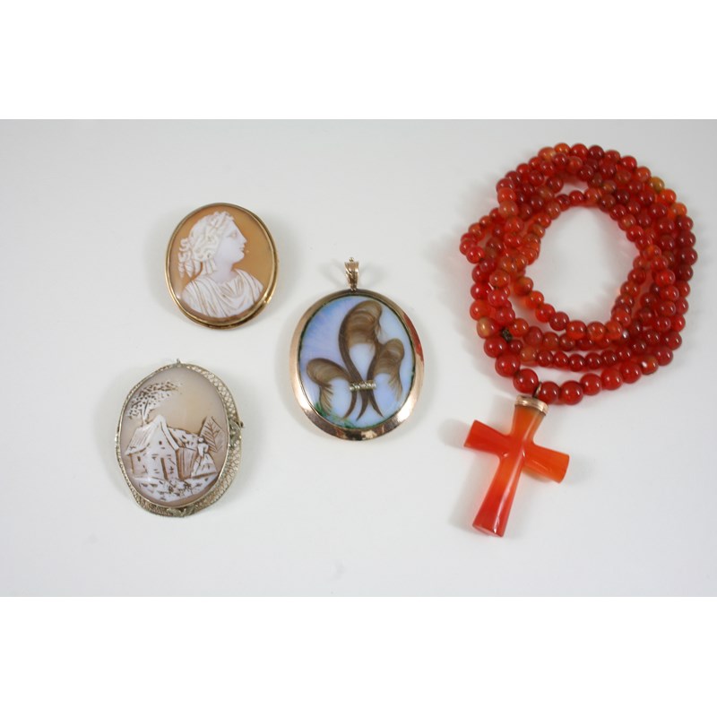 including an agate cruciform pendant and bead necklace, a carved shell cameo brooch depicting the profile of a classical figure, a mourning pendant containing hair and a carved shell cameo brooch pendant depicting a wintry scene.