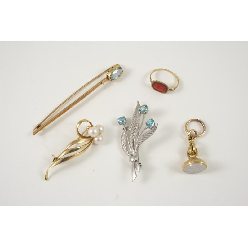 the long gold brooch is mounted with a circular-cut aquamarine, 7cm. long, together with a white gold foliate spray brooch set with three circular zircons, 5cm. long, a gold and cultured pearl brooch, 5cm. long, a gold ring mounted with a carnelian intaglio and a small gold fob seal with agate matrix, 2cm. high.