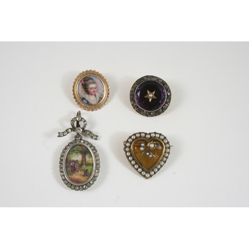 the heart-shaped brooch is centred with a citrine mounted with a pearl set flower motif, within a surround of small pearls, in gold, 2.8cm. wide, together with an amethyst circular brooch mounted with a gold and pearl star motif within a surround of paste stones, in gold, 2.5cm. dia., a paste set pendant and a circular portrait brooch.