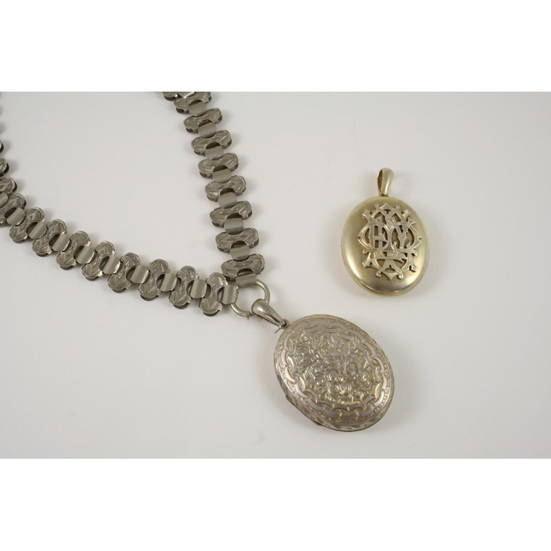A VICTORIAN METAL PENDANT AND CHAIN with engraved decoration, together with another locket pendant embossed with initials.