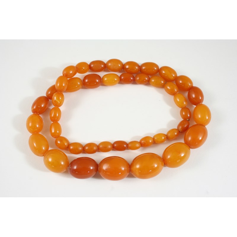 A SINGLE ROW GRADUATED AMBER BEAD NECKLACE 58cm. long, 47 grams.