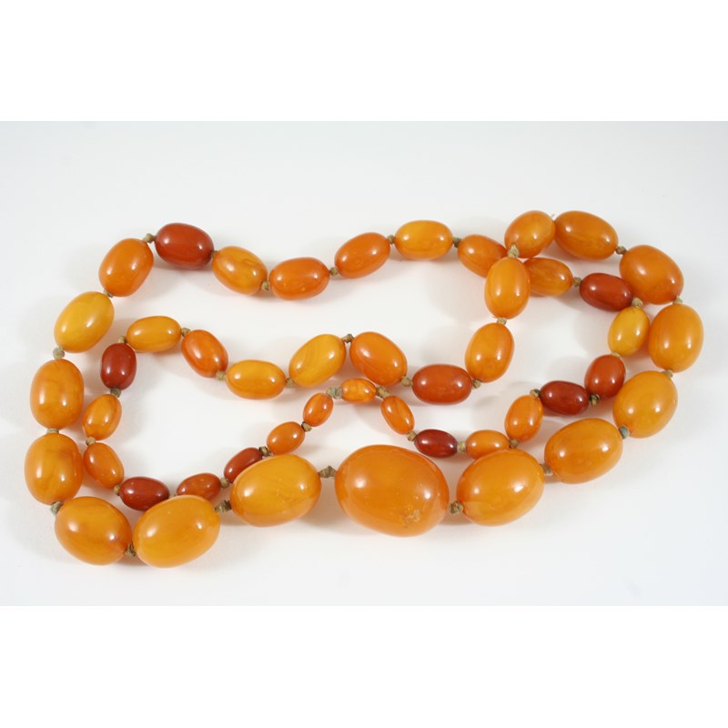 A SINGLE ROW GRADUATED AMBER BEAD NECKLACE 90cm. long, 87 grams.