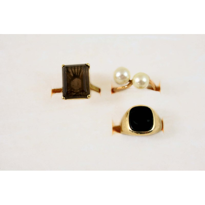 the rectangular-shaped smoky quartz is set in 18ct. gold, size O, together with a cultured pearl cross-over ring, size P 1/2, and a black onyx and 9ct. gold signet ring, size K 1/2.
