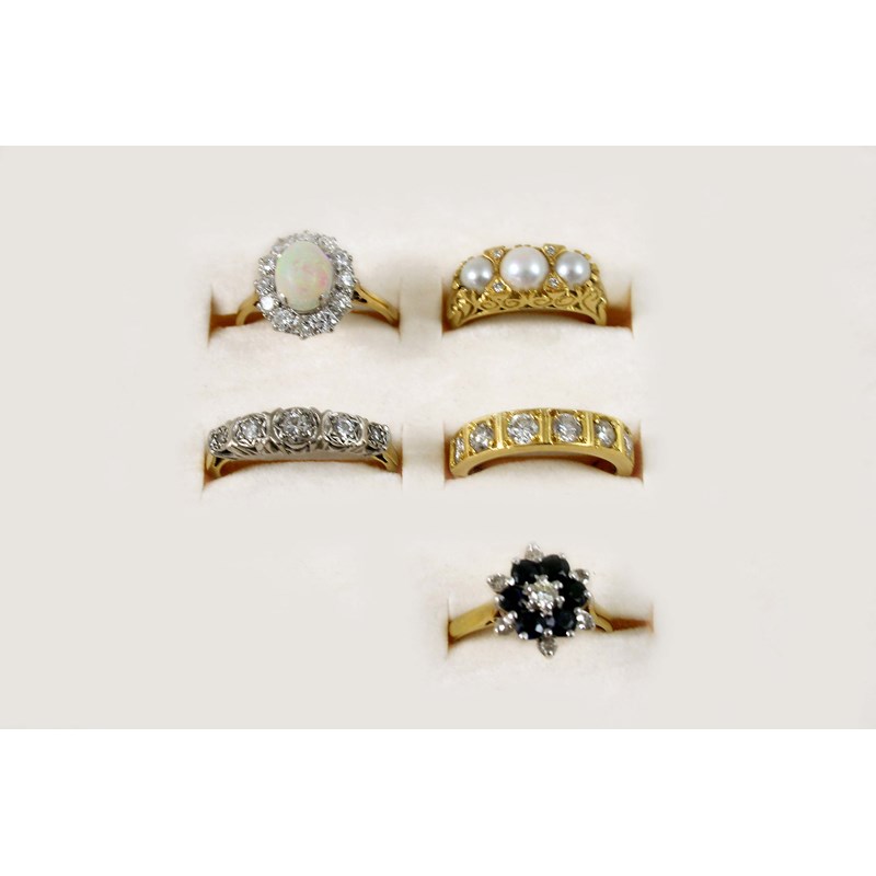 the oval cabochon solid white opal is set within a surround of circular-cut diamonds, in 18ct. gold, size P 1/2, a diamond half hoop ring, set with seven circular-cut diamonds, in 18ct. gold, size N, a pearl and diamond ring, the three graduated half pearls are set with four small diamonds in 18ct. gold, size M, a sapphire and diamond cluster ring, set with circular-cut sapphires and diamonds, in 18ct. gold, size N and a diamond five stone ring, set with five circular-cut diamonds, in 18ct. gold, size R 1/2.