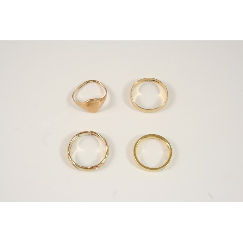 the 18ct. gold band is set with three small diamonds, size L, a 9ct. three colour gold twisted band ring, size P, a 9ct. gold wedding band, size Q, and a 9ct. gold signet ring, size K.