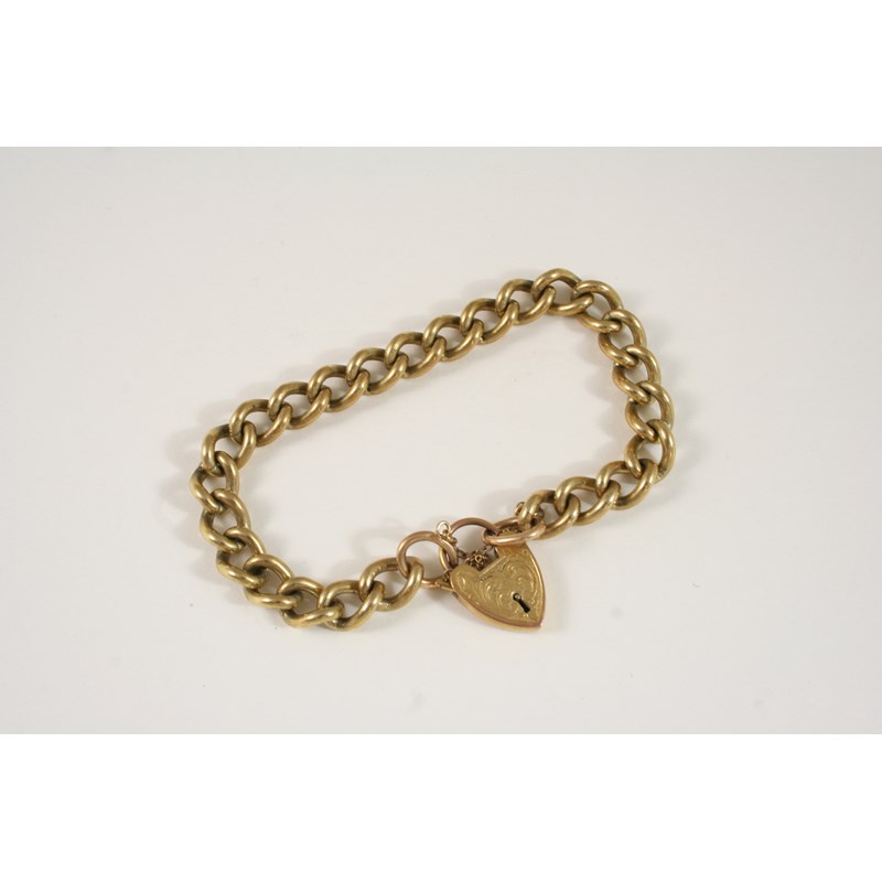 A 9CT. GOLD CURB LINK BRACELET with padlock clasp, 19cm. long, 32 grams.