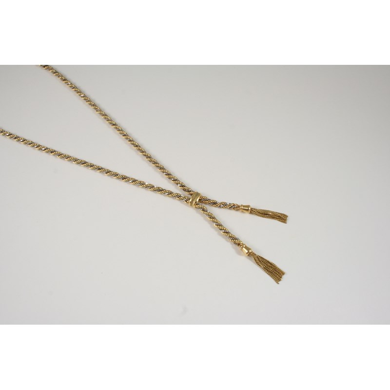 A 9CT. TWO COLOUR GOLD TASSEL NECKLACE of twisted rope design, 47cm. long, 23 grams.