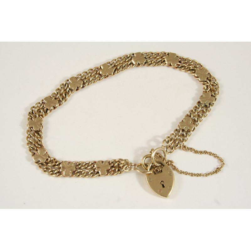 A 9CT. GOLD DOUBLE ROW CURB LINK BRACELET mounted with shamrocks and with padlock clasp, 19cm. long, 10.8 grams.