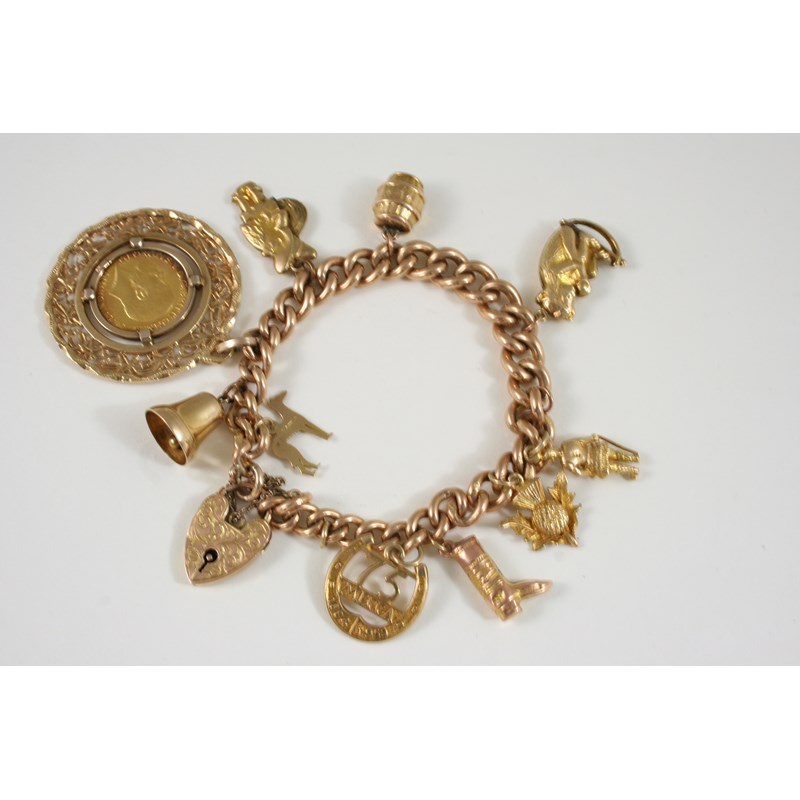 A 9CT. GOLD CURB LINK BRACELET with foliate engraved padlock clasp and suspending assorted charms, including a half sovereign, 1914, in a 9ct. gold pierced foliate pendant mount, total weight 46 grams.