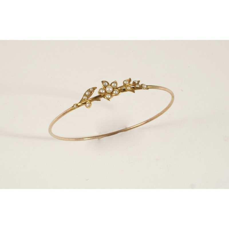 A GOLD AND PEARL SET BANGLE the foliate decoration set with small half pearls.