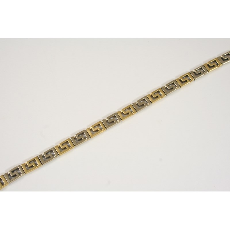 AN 18CT. TWO COLOUR GOLD BRACELET formed with openwork geometric links, with concealed clasp, 18.5cm. long, 22 grams.