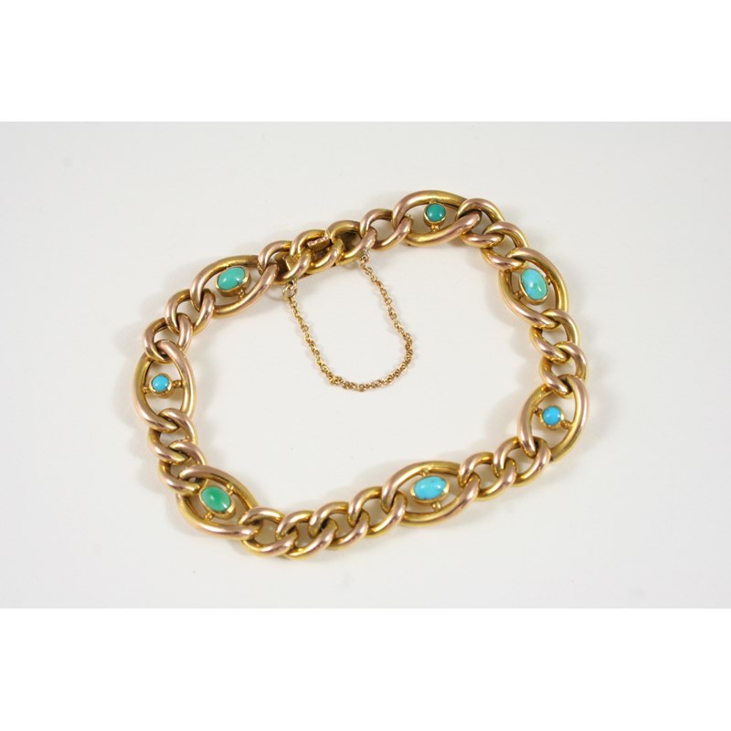 A 9CT. GOLD AND TURQUOISE BRACELET the curb link bracelet is mounted with oval and circular turquoise cabochons, concealed clasp, 19cm. long, 12 grams.