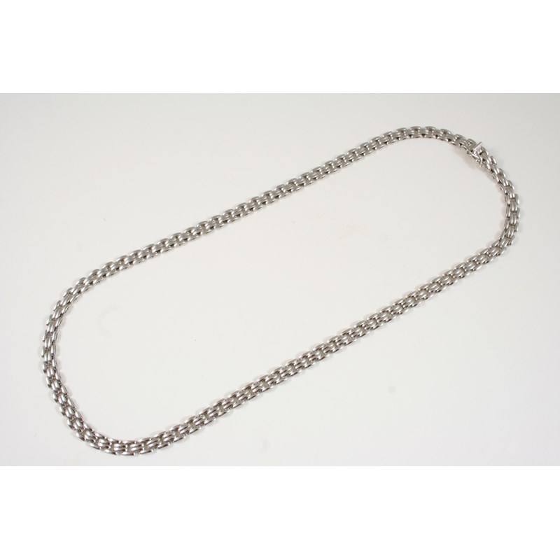 AN 18CT. WHITE GOLD NECKLACE formed with long domed links, with concealed clasp, 44.5cm. long, 21 grams.