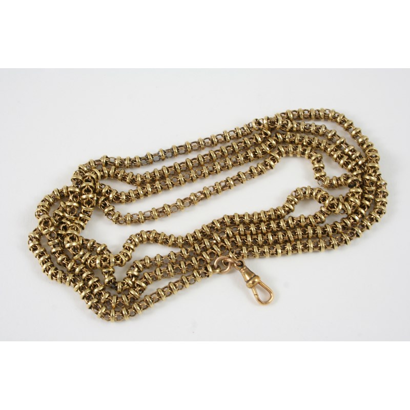 A GOLD FANCY LINK LONG GUARD CHAIN 134cm. long, 51 grams.