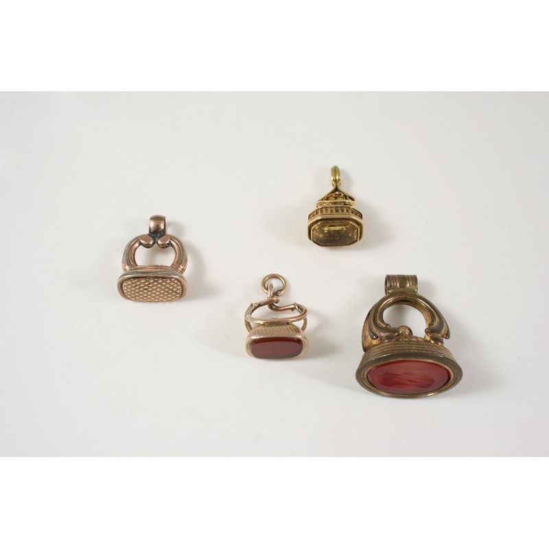 mounted with a citrine matrix engraved with initials, 2.5cm. high, together with a gold snake fob seal, mounted with a carnelian matrix and two other fob seals.