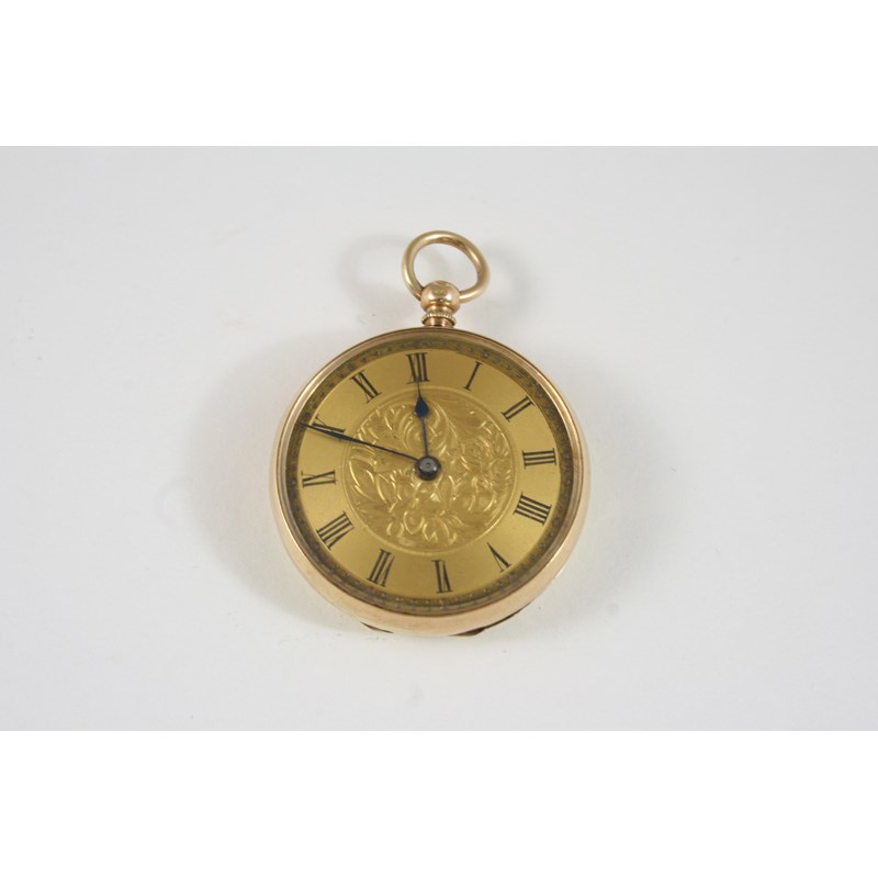 A 14CT. GOLD OPEN FACED POCKET WATCH the gold foliate dial with Roman numerals, engraved foliate and cartouche decoration to the back case, metal inner case, 35mm. dia.