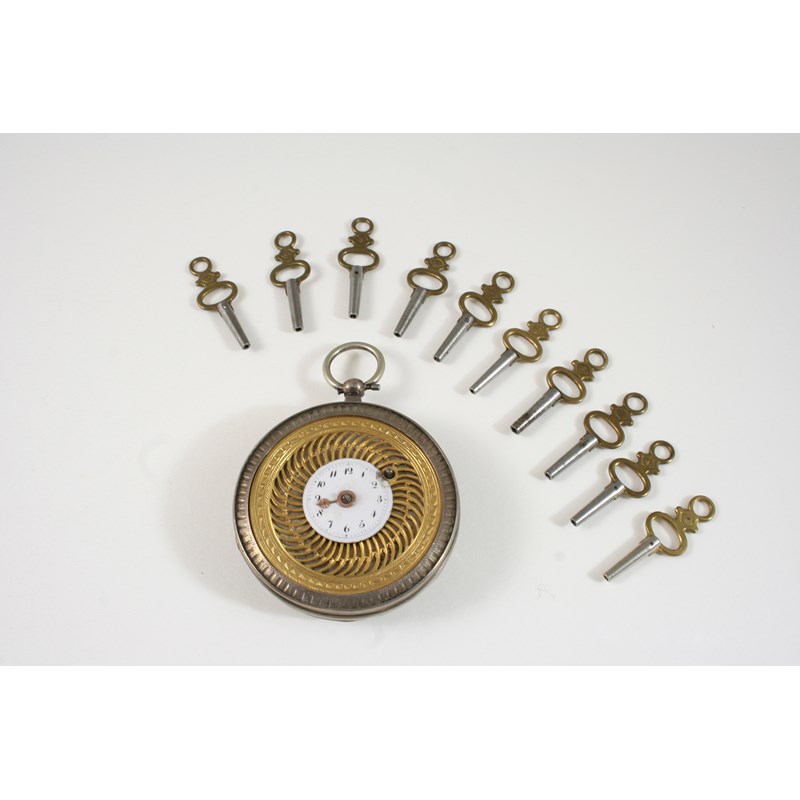 the silver and gilt front case centred with white enamel dial with Arabic numerals, 5.2mm. dia., with unrelated outer case and various watch keys.