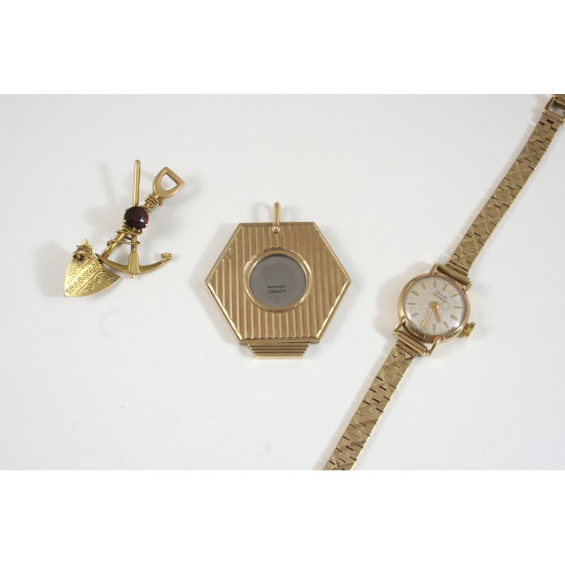 the signed circular dial with baton numerals, on a gold bracelet with ladder clasp, 16cm. long, 18 grams, together with a 9ct. gold mining brooch and a gold locket pendant by Asprey.