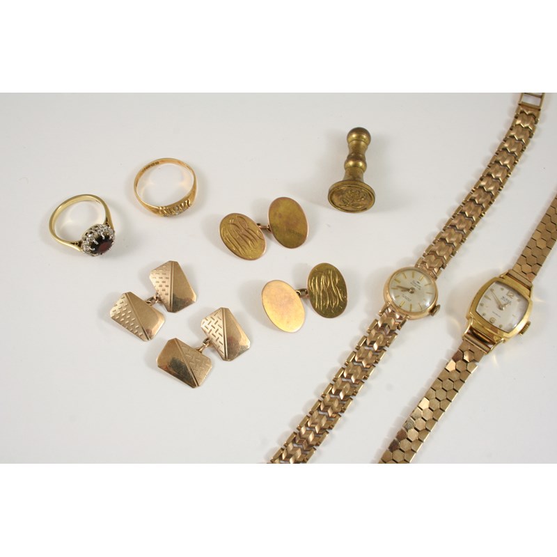 including two 9ct. gold wristwatches, a garnet and diamond cluster ring, set in 18ct. gold, size N 1/2, a diamond five stone ring, one stone missing, set in 18ct. gold, size R, and two pairs of 9ct. gold cufflinks, 7.6 grams.