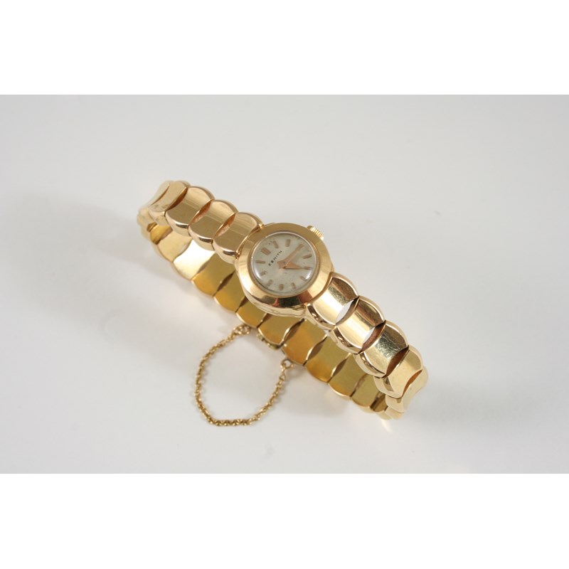 A LADY'S GOLD WRISTWATCH BY ZENITH the signed circular dial with baton numerals, on an integrated fancy link bracelet, numbered 60469 to the reverse, 17cm. long, 30 grams.