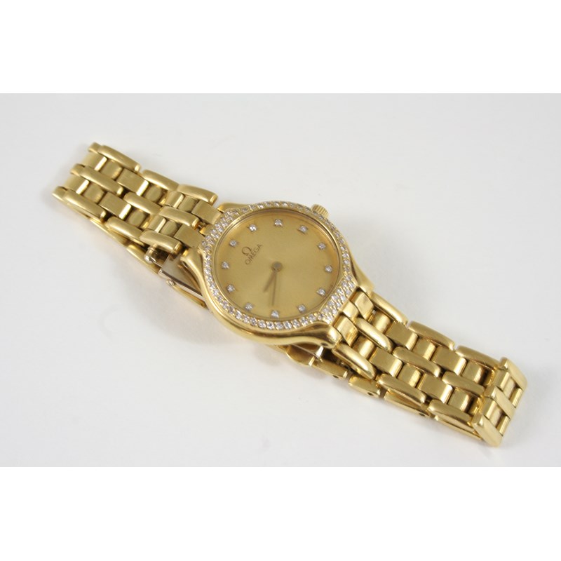 A LADY'S 18CT. GOLD AND DIAMOND WRISTWATCH BY OMEGA the signed circular dial with diamond numerals, with further circular-cut diamonds set to the bezel, on a gold Omega bracelet with deployant clasp.
