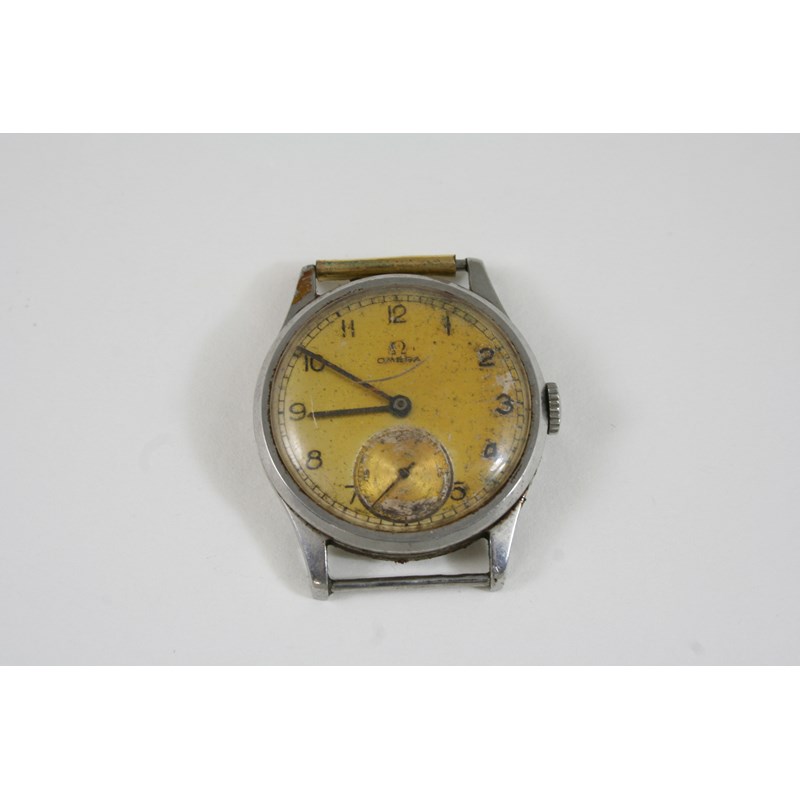 A STAINLESS STEEL WRISTWATCH BY OMEGA the signed circular dial with Arabic numerals and subsidiary seconds dial, 34mm., strap missing.